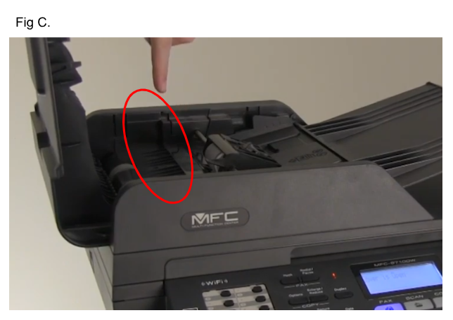 If your printer has a top feeder, you will need to open it and clean the glass strip inside the feeder mechanism. (Fig. C and Fig. D)