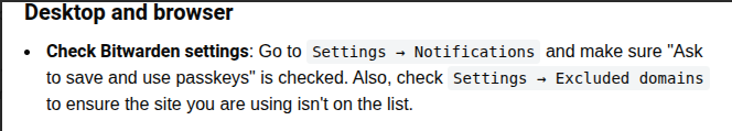 If you are getting a 'No passkeys available' pop up when trying to log into a website (Fig. 1), you need to update your Bitwarden settings (Fig. 2)
