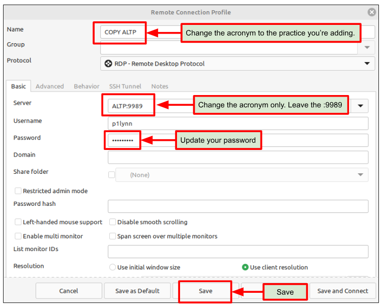 Note: you must complete this procedure using the Remmina desktop shortcut and not from the start menu or the taskbar applet.