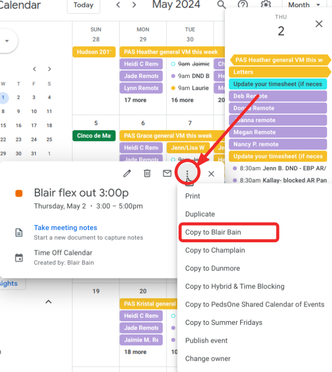 If you save your event and forgot to invite to Time Off Calendar, OR if you want to copy an already existing event to another calendar: