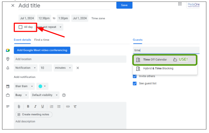 After you’ve entered the details for your event (flex time, CTO, PET, etc.), invite the Time Off Calendar to the event. Please be mindful of which calendar you are choosing, do not schedule on Hybrid or PedsOne Shared calendar.